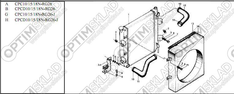 | 14 | N041-332000-000 | Кожух радиатора | C CPC10/15/18N-RW9;D CPCD10/15/18N-RW9 |